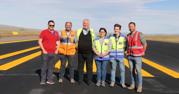 El Seremi de Obras Públicas, Patricio Sanhueza Ulloa, junto a la directora regional de Aeropuertos del MOP Anita Álvarez Lemus y equipo, el Jefe del Aeródromo de Balmaceda DGAC Andrés Murillo Bravo…